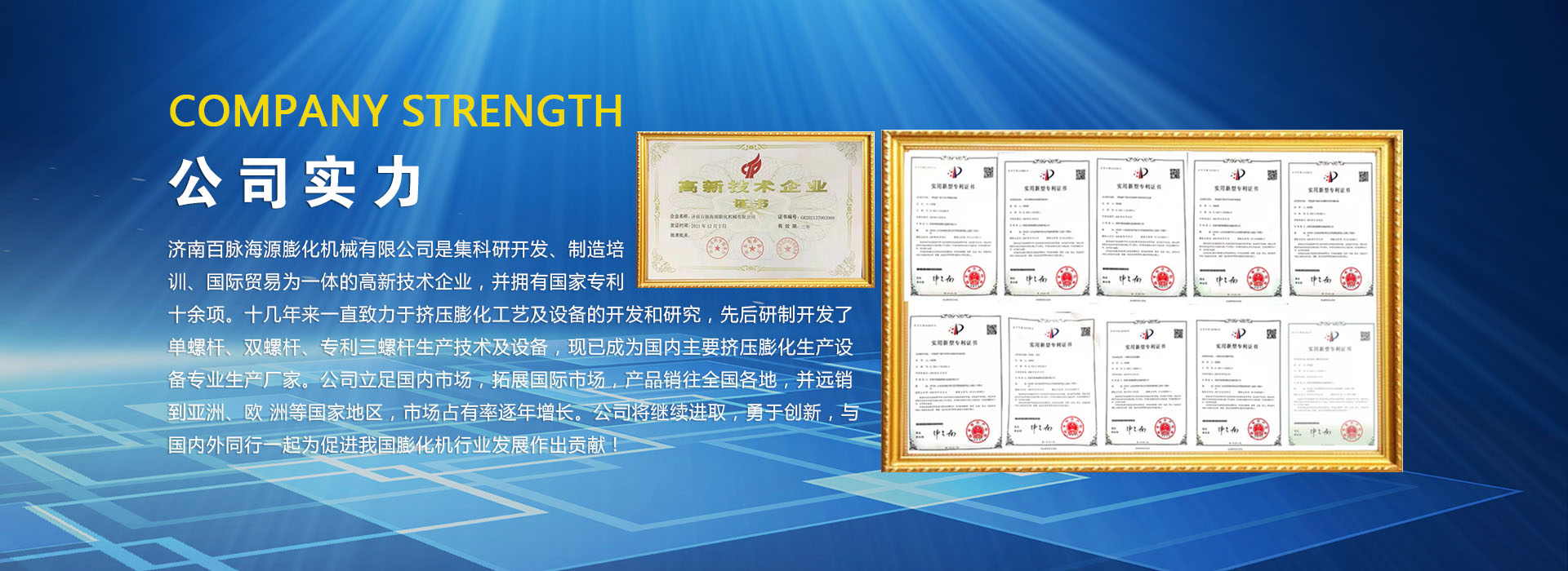 濟(jì)南百脈海源膨化機(jī)械有限公司是集科研開(kāi)發(fā)、制造培訓(xùn)、國(guó)際貿(mào)易為一體的高新技術(shù)企業(yè),并擁有國(guó)家專(zhuān)利十余項(xiàng)。十幾年來(lái)一直致力于擠壓膨化工藝及設(shè)備的開(kāi)發(fā)和研究,先后研制開(kāi)發(fā)了單螺桿、雙螺桿、專(zhuān)利三螺桿生產(chǎn)技術(shù)及設(shè)備,現(xiàn)已成為國(guó)內(nèi)主要擠壓膨化生產(chǎn)設(shè)備專(zhuān)業(yè)生產(chǎn)廠家。公司立足國(guó)內(nèi)市場(chǎng),拓展國(guó)際市場(chǎng),產(chǎn)品銷(xiāo)往全國(guó)各地,并遠(yuǎn)銷(xiāo)到亞洲、歐洲等國(guó)家地區(qū),市場(chǎng)占有率逐年增長(zhǎng)。公司將繼續(xù)進(jìn)取,勇于創(chuàng)新,與國(guó)內(nèi)外同行一起為促進(jìn)我國(guó)膨化機(jī)行業(yè)發(fā)展作出貢獻(xiàn)!